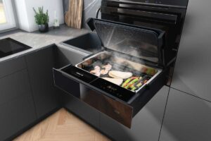 Představte si, jak v troubě připravujete křupavou pečeni, zatímco v zásuvce se jemně a precizně vaří zelenina v páře. I přes své kompaktní rozměry nabízí působivou kapacitu 10 litrů, dostatečnou například pro 2,5 kg brambor.