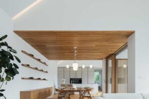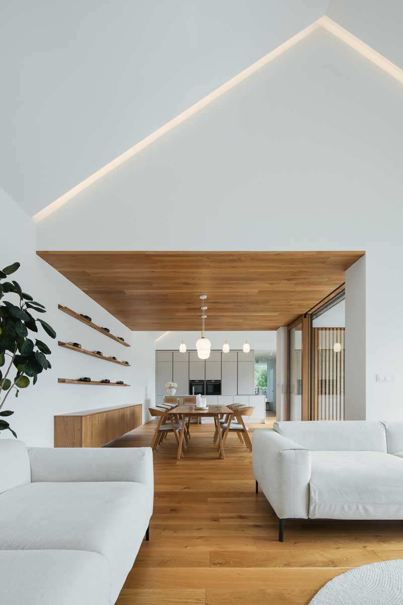 Interiér pracuje se světlými tóny a dubovým dřevem, které se objevuje jak na podlahách, tak na obkladu stropu jídelny. Důraz na jednoduché a čisté detaily podporuje klidnou atmosféru domu a vytváří nadčasový dojem bez zbytečné okázalosti.